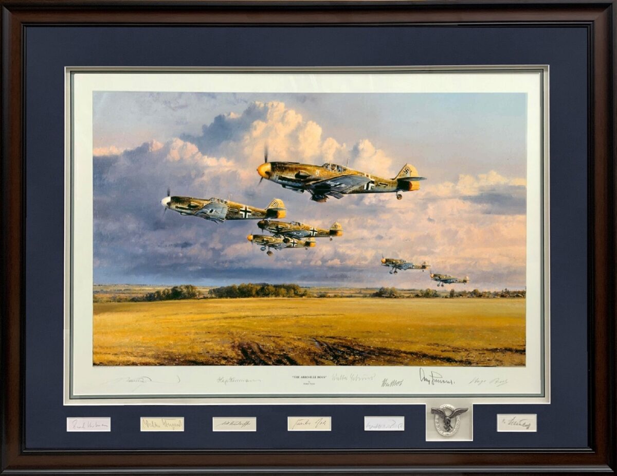 To make it even more special, we have custom framed this copy to include a museum quality reproduction Luftwaffe Pilot’s badge, and the original autographs of Six famous Luftwaffe Aces, including the highest scoring Fighter Ace in History: