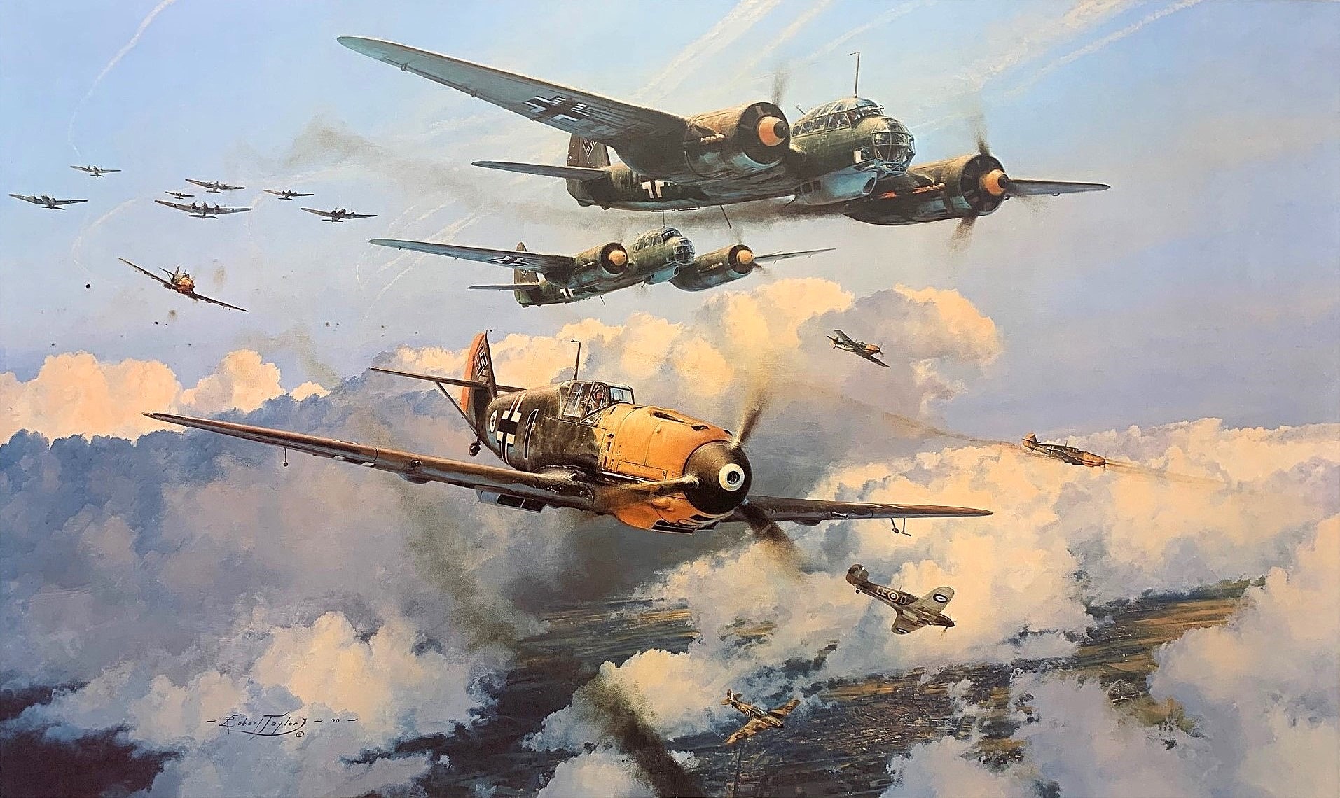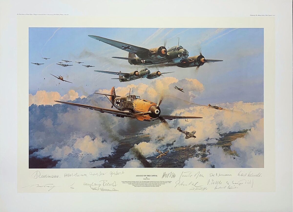 A majestic painting by the world’s foremost aviation artist, depicting a moment from the defining day in the most significant air battle ever fought. Each print is signed by five renowned Luftwaffe fighter Aces who fought in the Battle of Britain: