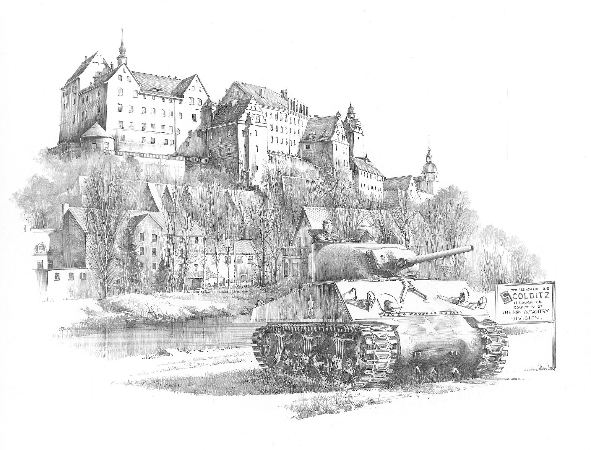 This edition, reproduced from a pencil drawing by Nicolas Trudgian, depicts the imposing castle shortly after being liberated by American troops in April 1945. In the foreground below a Sherman Tank of the 9th Armored Division stands on watch, close to the sign that was erected by the US 69th Infantry Division.