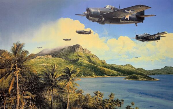 Captain Joe Foss leads the F4F Wildcats of VMF-121 back to Henderson Field after a day of desperate fighting against the Japanese, in the skies over the steaming jungles of Guadalcanal – November 1942. It would be another three months before the island was finally secured, during which time Foss would achieve an astonishing 26 victories to become the first American pilot to equal WW1 Ace Eddie Rickenbacker’s score.
