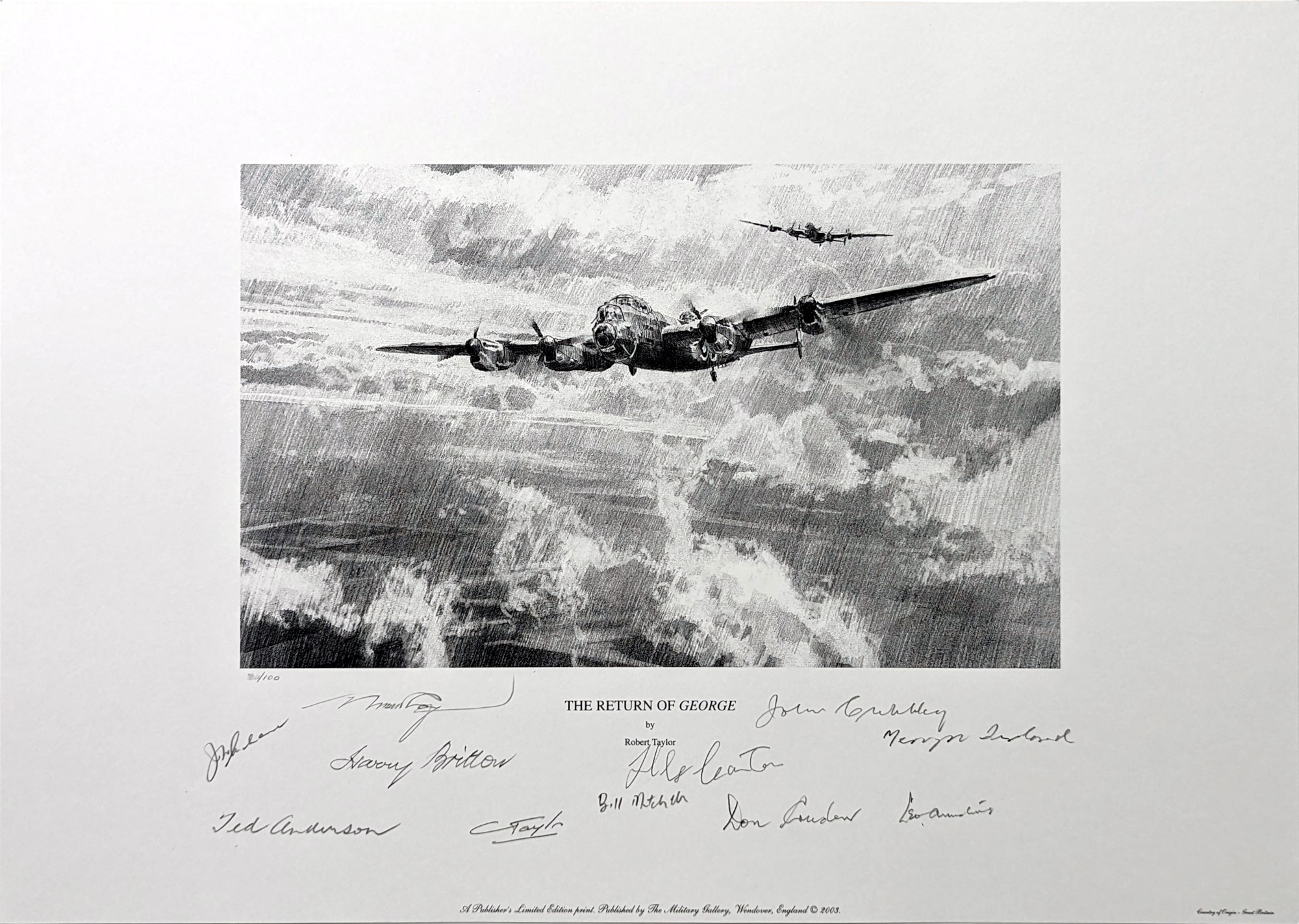 This edition is also issued with a matching numbered print of Robert Taylor’s drawing RETURN OF GEORGE, signed by a further Ten RAAF Aircrew, making a total of 21 signatures.