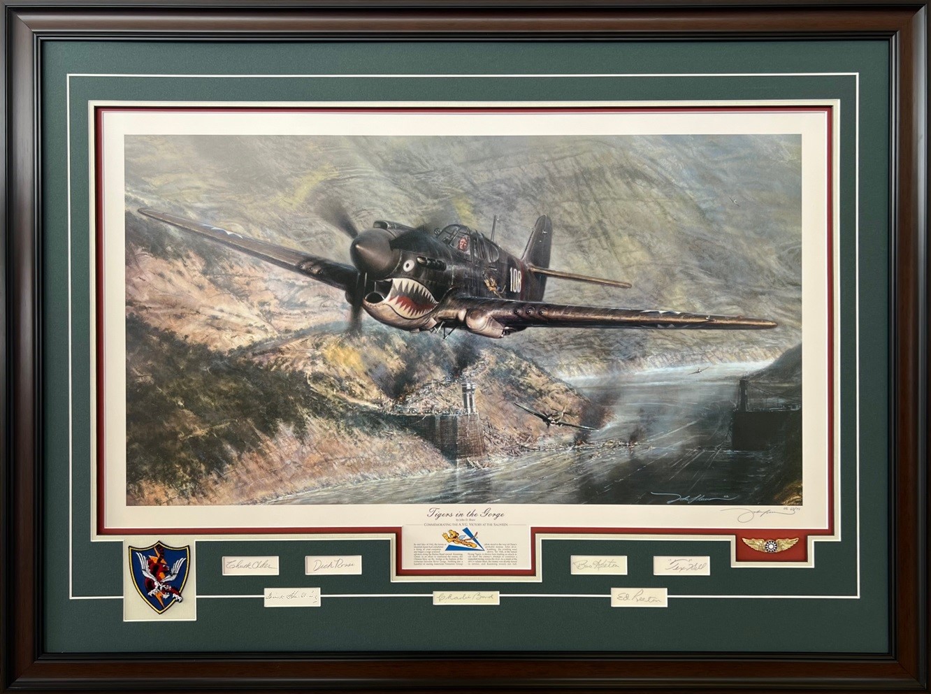 The painting Tigers in the Gorge was completed in 2002. This was John Shaw’s third in series of AVG scenes, preceded by American Volunteer Group in China (1995), and By the Dawn’s Early Light (1996). A lithograph edition was signed by members of the AVG at a gathering in San Antonio, Texas that year, the home town of the well-loved AVG ace “Tex” Hill.